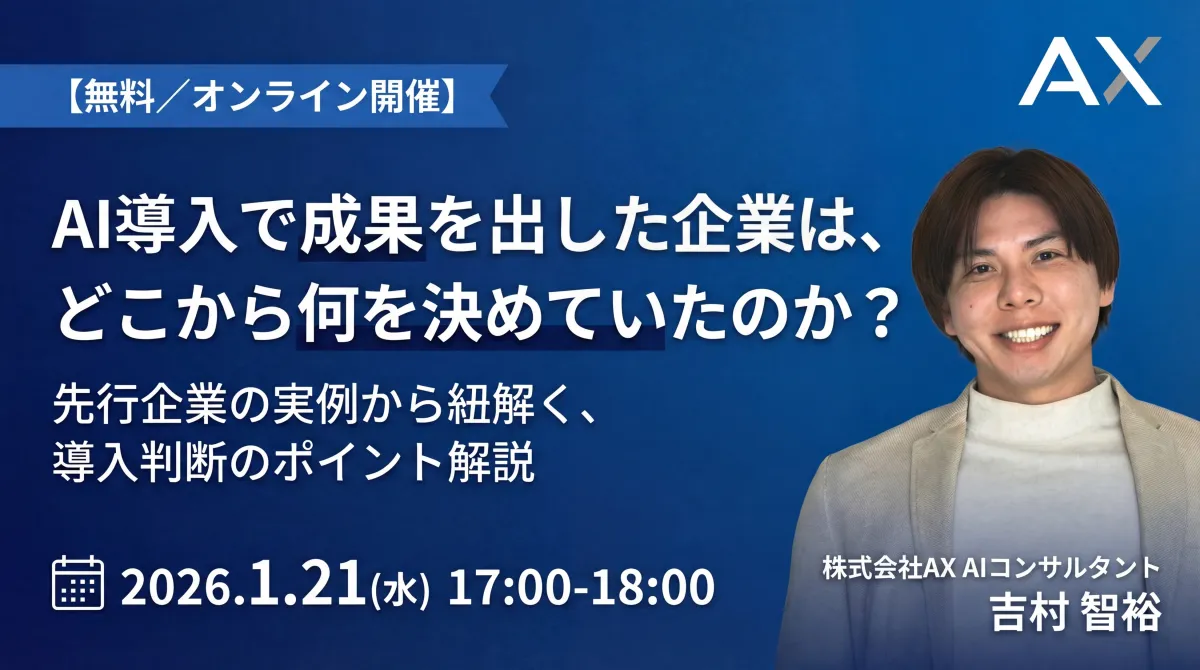 株式会社AXが1月21日(水)にオンラインセミナー「AI導入で成果を出した企業は、どこから何を決めていたのか?」を開催します。このセミナーでは、AIを導入しているが初めの一手を決めかねている企業や、すでに導入済みでも次のステップに迷っている経営者・事業責任者に向けて、具体的な判断ポイントを実践的に解説します。参加費は無料で、Zoomを利用したオンライン形式で行われます。