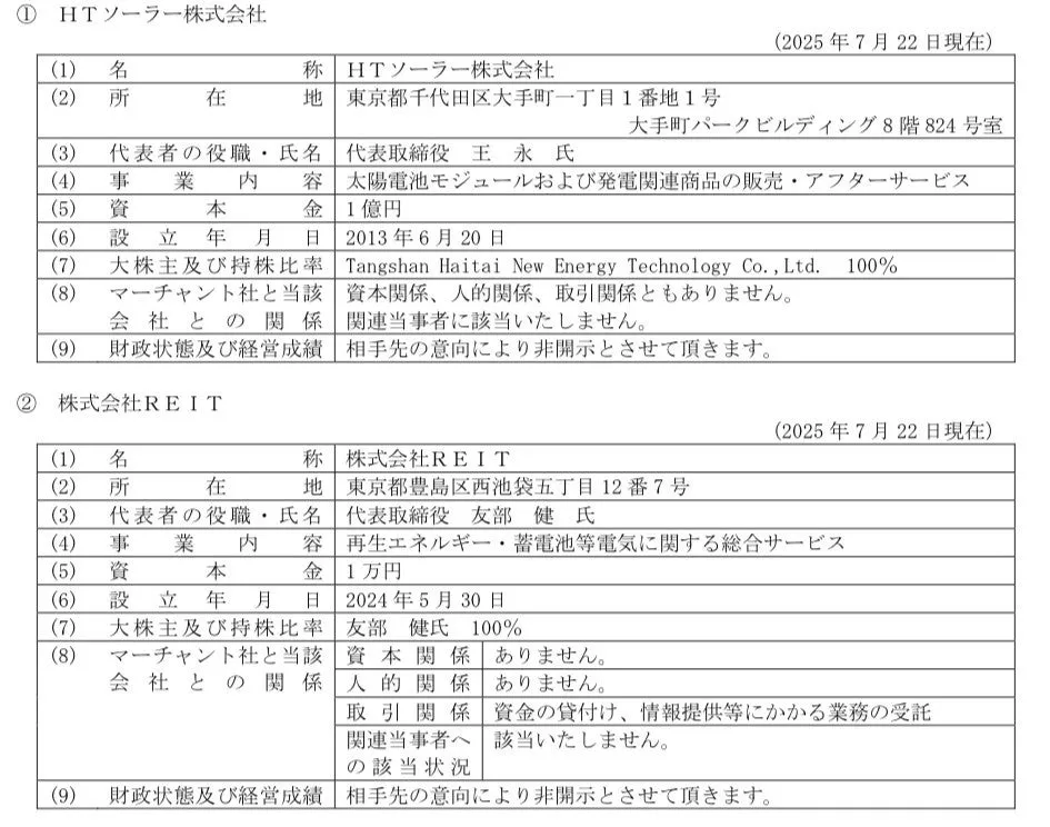 業務提携に関する基本合意は2025年7月22日に締結され、各社の具体的な役割分担も整理されています。REIT社は、用地の確保や必要な契約調整を担当し、マーチャント社は投資資金のバックアップを行うことになります。そして、HTソーラー社は、取得した用地で再生可能エネルギー事業を進めていきます。
