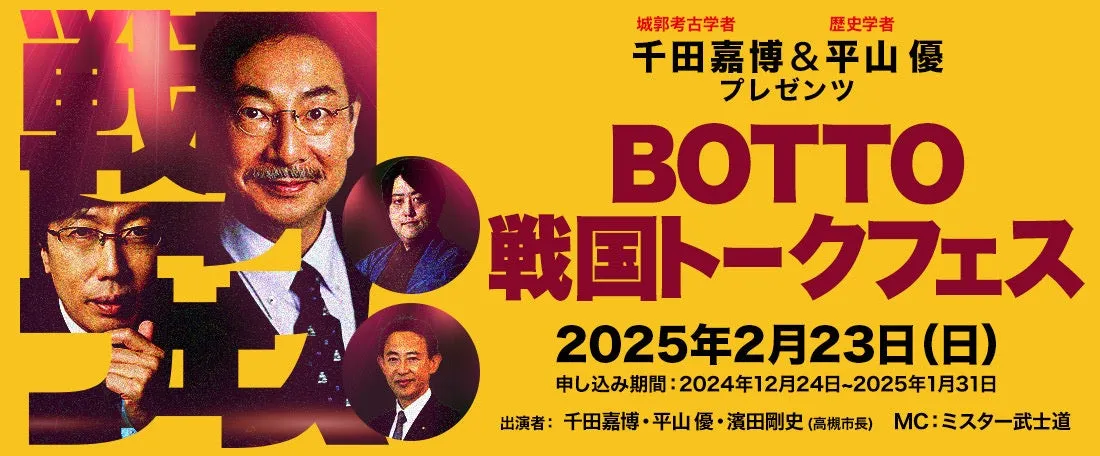 「BOTTO戦国トークフェス」は、歴史を愛する人々に向けて高槻の魅力を発信するプロモーション「BOTTOたかつき」の一環として行われます。このイベントには、城郭考古学の第一人者である千田嘉博氏、歴史学者として名を馳せる平山優氏、さらにはYouTubeで大人気の歴史解説者ミスター武士道氏が登壇予定です。