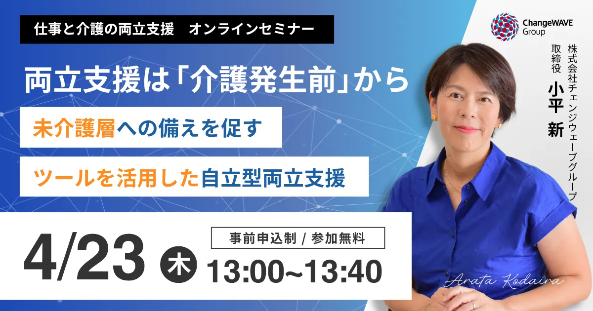 株式会社チェンジウェーブグループが2026年4月23日(木)に無料オンラインセミナー「両立支援は『介護発生前』から」を開催します。このセミナーは、企業が従業員の仕事と介護を両立させるための支援策について、特に未介護層に焦点を当てた内容になっています。