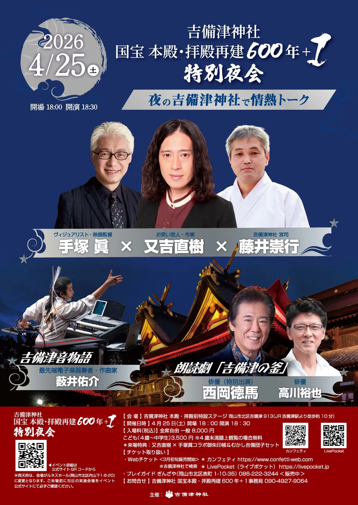 この特別な夜会では、ヴィジュアリストの手塚眞氏や、お笑い芸人・作家の又吉直樹氏、吉備津神社の宮司である藤井崇行氏が揃って出演します。彼らによる「夜の吉備津神社で情熱トーク」と題した公開トークセッションでは、文化、芸術、歴史に関する深いトピックが盛り上がります。