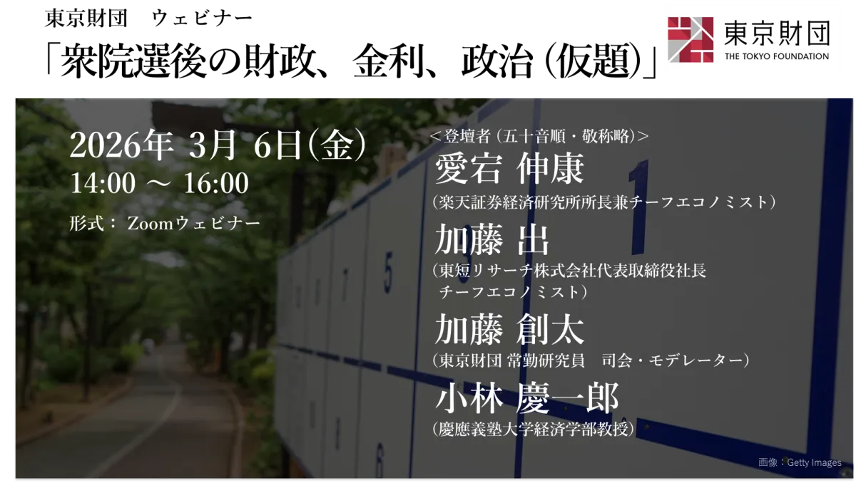 2026年3月6日(金曜日)、東京都港区に本拠を置く公益財団法人東京財団が、特別なウェビナー「衆院選後の財政・金利・政治(仮題)」を開催します。このイベントは、新たな政治環境下での財政と金融政策について重要な洞察を提供することを目的としています。