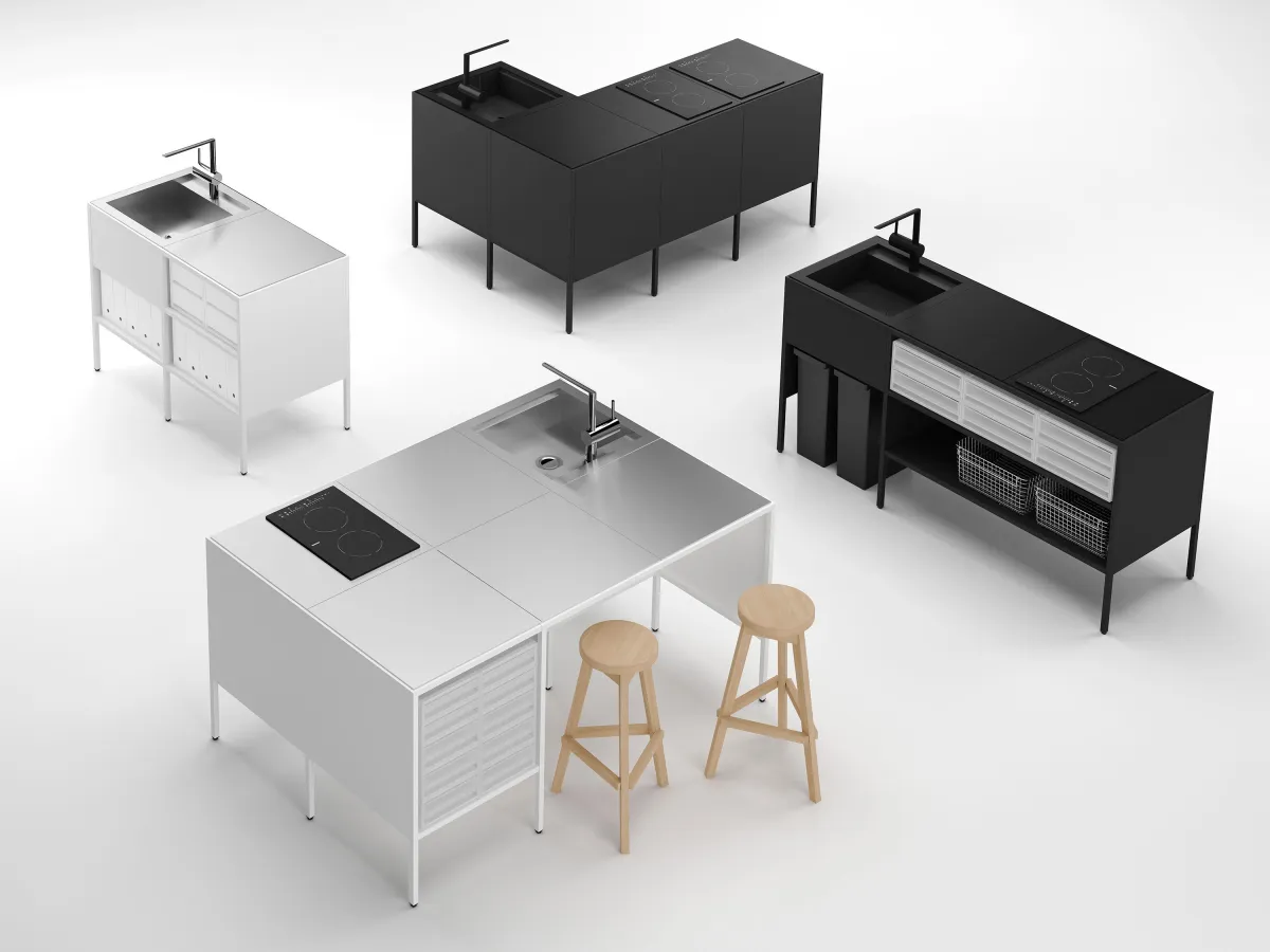 主に使用しているスチールとステンレスにより、シンプルかつモダンなデザインが特徴です。この構造では、独立したパーツを組み合わせることで効率的な空間利用が可能となり、不要な要素をそぎ落とすことで必要な機能に焦点を当てています。さらに、部材を交換することで長期間使用できるため、環境への配慮も忘れません。