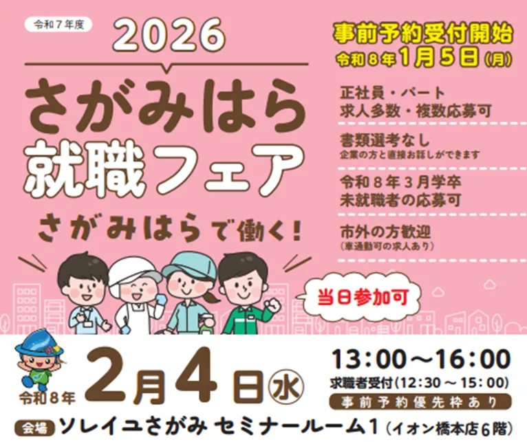 相模原市内での就職を希望するすべての方々が対象ですが、市外在住者も歓迎されます。参加は無料ですが、事前予約が必要です。予約受付は、2026年1月5日から2月2日までで、先着順に定員100名に制限されています。予約ができなかった場合でも、当日受付による面接が可能ですが、待ち時間が発生することがありますので、予定を考慮して参加してください。