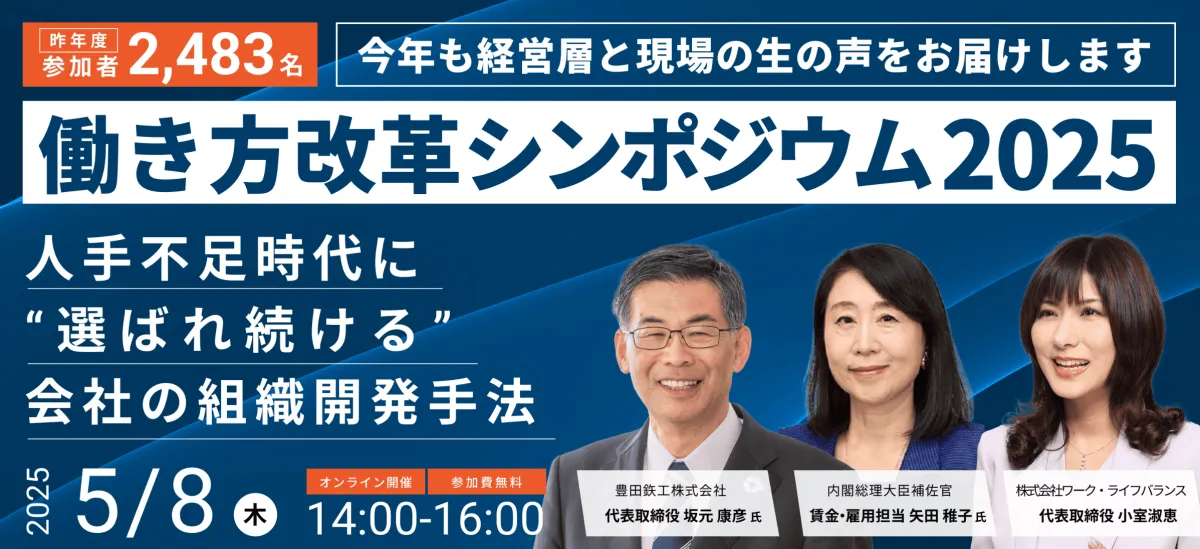 2025年の5月8日に、株式会社ワーク・ライフバランスが主催する「働き方改革シンポジウム2025」がオンラインで開催されることが発表された。本シンポジウムは14時から16時までの2時間にわたり、賃金・雇用担当の内閣總理大臣補佐官である矢田稚子氏や、豊田鉄工株式会社の社長・坂元康彦氏をゲストとして迎え、最新の働き方改革に関する情報や実例を参加者に伝える。