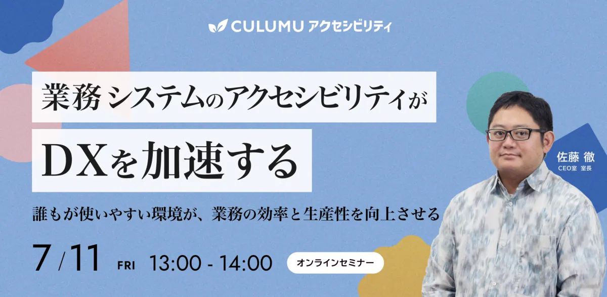 開催日時は2025年7月11日(金)13:00から14:00です。現代の業務システムに求められるアクセシビリティを理解し、企業における実践に役立ててください。