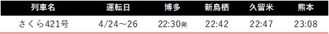 また、4月24日から26日までの他の臨時列車の情報については、3月10日に発表された資料を参照してください。詳細な時刻については、JR九州の公式ホームページの「駅別時刻表」で確認でき、特に追加の臨時列車の情報は4月20日頃に反映される予定です。
