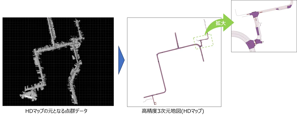 本格的な開発は2023年度からスタートし、次の年度までにHDマップ(高精度3次元地図)と未来の動的環境に対応するダイナミックマップの仕様策定を進めた。この地図データは、より直感的な自動運転を可能にするために、静的情報(HDマップ)と動的情報を統合し、リアルタイムで変化する環境に即応するという特徴がある。これにより、自動運転車両とその周囲の従業員双方にとって安全性と業務の効率化を図る仕組みの構築を目指している。