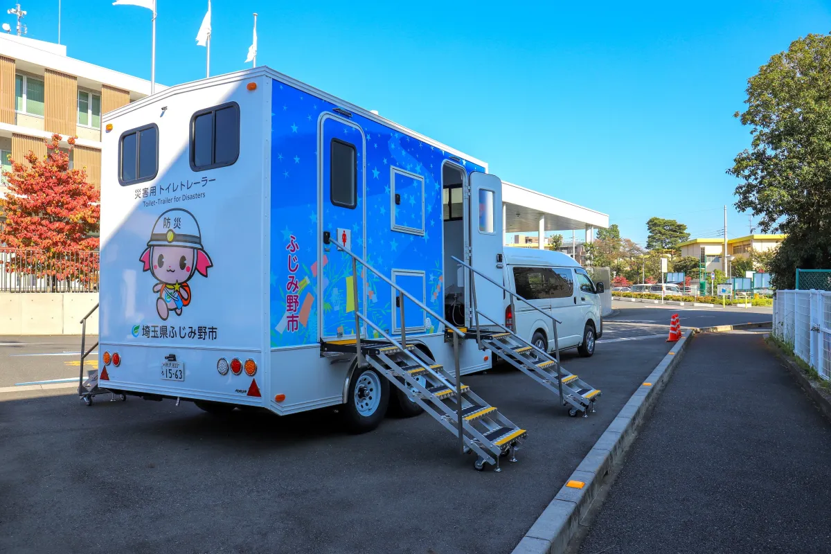 ふじみ野市が導入するトイレトレーラーは、4室の個室を備え、温水洗浄便座やベビーキープなど、衛生面に気を使った設計が施されています。さらに、ふじみ野市PR大使「ふじみん」のオリジナルデザインでラッピングもされており、目にも楽しいトイレトレーラーです。