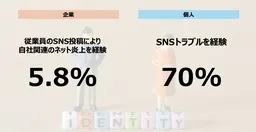 最新の調査結果によれば、企業の約5.8%が従業員のSNS投稿をきっかけにネット炎上を経験しており、個人の約70%がSNSトラブルに直面しています。SNSが業務外の問題を引き起こし、企業にとっての生産性や法的責任、レピュテーションに多大な悪影響を及ぼす場合があるのに、企業にはその問題を早期に検知・支援できる仕組みが欠如しています。ネット上の被害は表面化が難しく、深刻化すると離職や法務対応などの大きなコストが発生することもあります。
