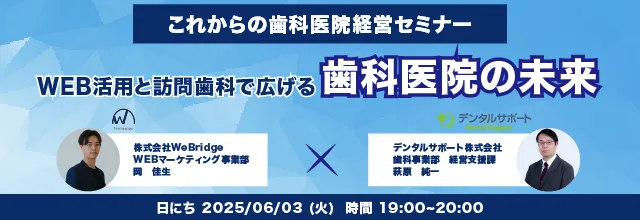 デジタル化が進み、高齢化社会が進む中で、歯科医院経営の形は大きく変わりつつあります。この流れに乗り遅れないためにも、最新の情報を押さえ、実践的な戦略を学ぶことが重要です。そこで、2025年6月3日19時から、無料ウェビナー「これからの歯科医院経営セミナー ~WEB活用と訪問歯科で広げる歯科医院の未来~」が開催されます。