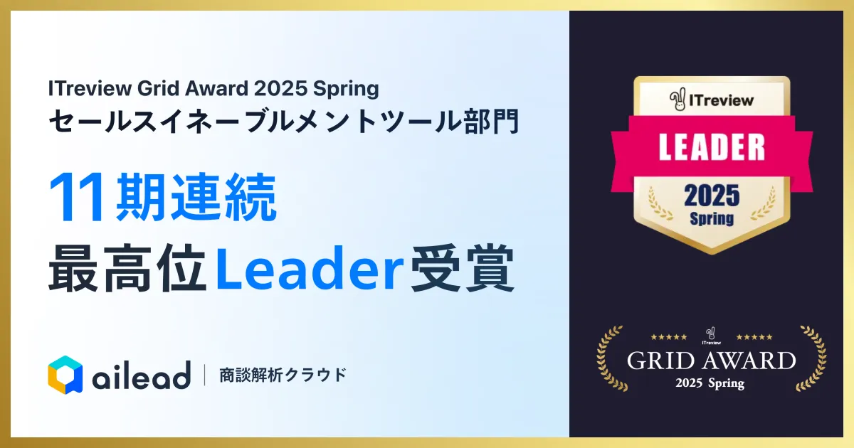 株式会社aileadが提供する商談解析クラウド「ailead」は、この度「ITreview Grid Award 2025 Spring」において、セールスイネーブルメント部門とSFA部門で最高位の「Leader」を11期連続で受賞しました。この評価は、実際に利用しているユーザーからの高い支持を礎にしており、営業支援ツールとしての信頼性と革新性が際立っています。