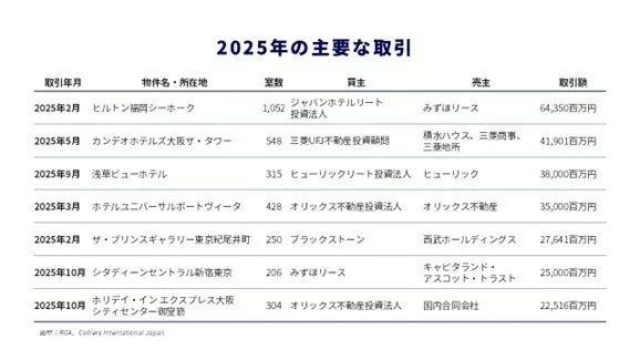 日本のホスピタリティ投資市場は、宿泊需要の旺盛さに支えられており、ホテルの供給が限られている異常な環境です。このため、2026年も海外からの投資は続くと予測されています。2025年の国内ホテル投資の総額は5,796億円に達し、特にヒルトン福岡シーホークやカンデオホテルズ大阪ザ・タワーといった大型取引が話題に上っています。