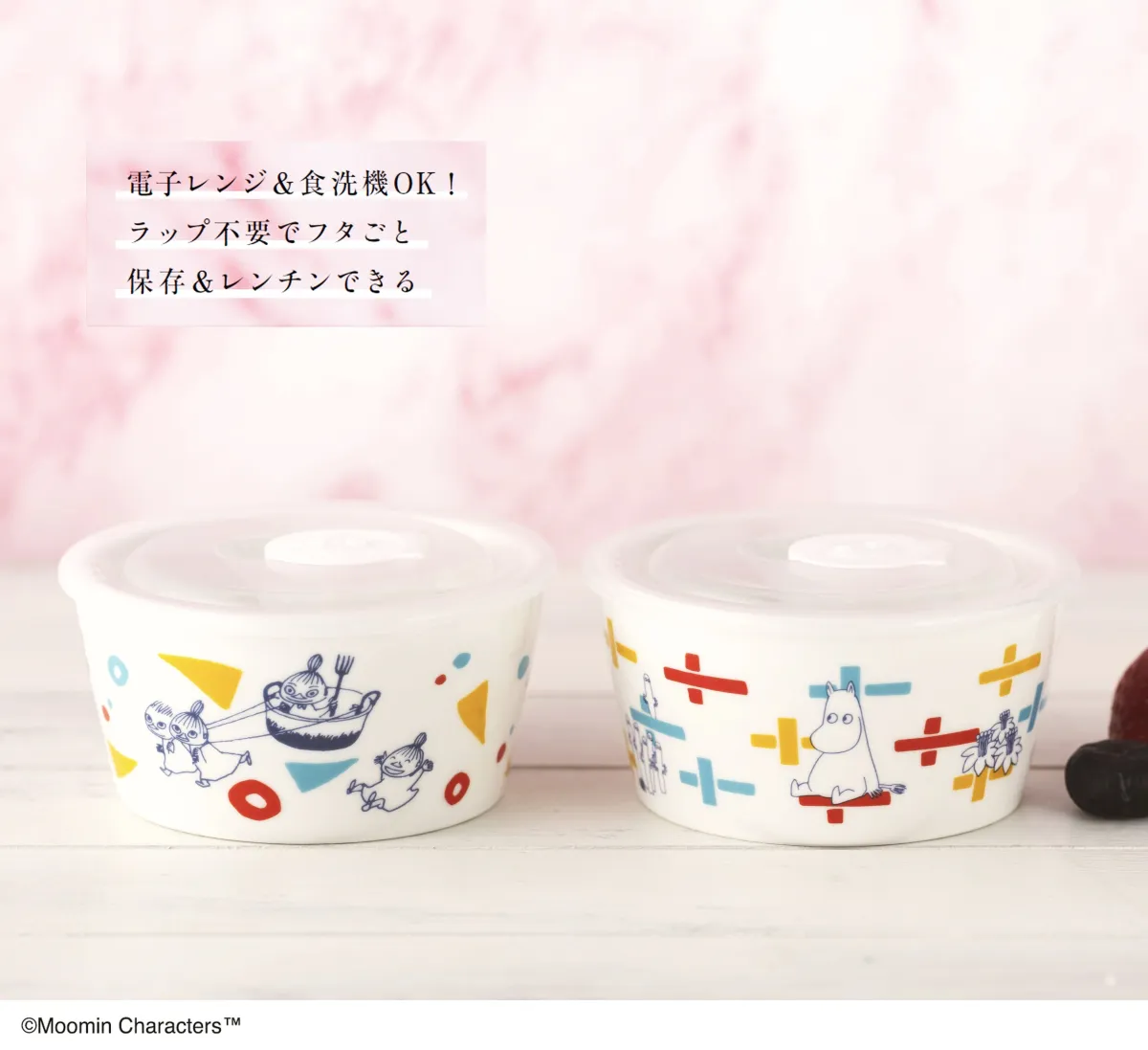 ムーミンやその仲間たちがデザインされた磁器の密閉保存容器が2個セットで付いてきます。高級感漂う磁器は、電子レンジや食器洗浄機にも対応しており、使い勝手も抜群です。