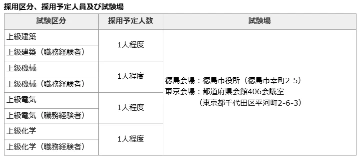 注目すべき点は、全職種において職務経験者(45歳まで)が対象となる試験区分が設けられていることです。これにより、経験を積んだ求職者にとってもチャンスが広がります。特に上級機械および上級化学については、現在進行中の令和7年度徳島市職員採用試験の随時募集の同職種区分において、最終合格者数が採用予定人員に達した場合、その時点で申込受付が中止となりますので、注意が必要です。