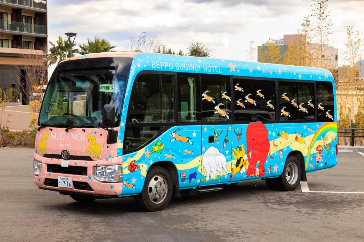杉乃井ホテルでは、彼のオリジナルイラストを使ったラッピングバス2台を用意し、別府駅からホテルへの送迎を行います。このバスは「宙館」「星館」「虹館」といった杉乃井ホテルの象徴的な施設をモチーフにしたデザインで、別府を感じさせるイラストが施されています。そのため、乗車するだけでなく、街を移動する楽しさも提供されることでしょう。
