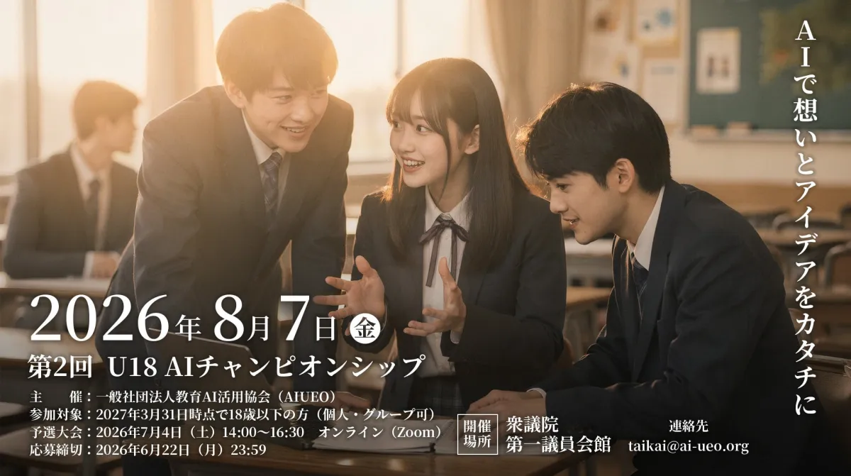 2026年8月、東京で「第2回 U18 AIチャンピオンシップ」が開催されることが決定しました。この大会は18歳以下の若者を対象にした全国的なAIプレゼンテーションコンテストで、参加者はAI機能を駆使して「自分の好きを深掘り」あるいは「身の回りの課題解決」のアイデアを発表することが求められます。主催は一般社団法人教育AI活用協会で、参加は無料です。応募受付は2026年6月22日までで、興味のある方はぜひこの機会に挑戦してください。