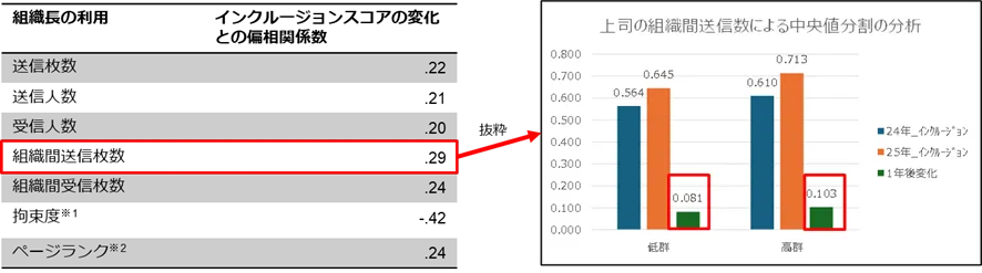 PRAISE CARDを活用し、称賛活動に取り組む組織では、従業員が自分の存在や貢献を認められていると感じるスコアが向上する傾向が見られました。特に、積極的に称賛する上司がいる組織では、従業員が歓迎され、尊重されているとの認識が高まりました。これは、上司が部下とのポジティブな関係を築くことで、組織全体の雰囲気を良好に保つ要因となっています。