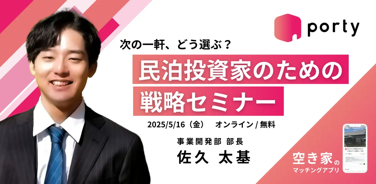 株式会社ポルティが主催するオンラインセミナー「民泊投資家のための戦略セミナー:次の一軒、どう選ぶ?」が、2025年5月16日(金)午後7時から開催されます。このイベントは、民泊事業を運営している方々に向け、次の物件選びに関する深い洞察を提供することを目的としています。