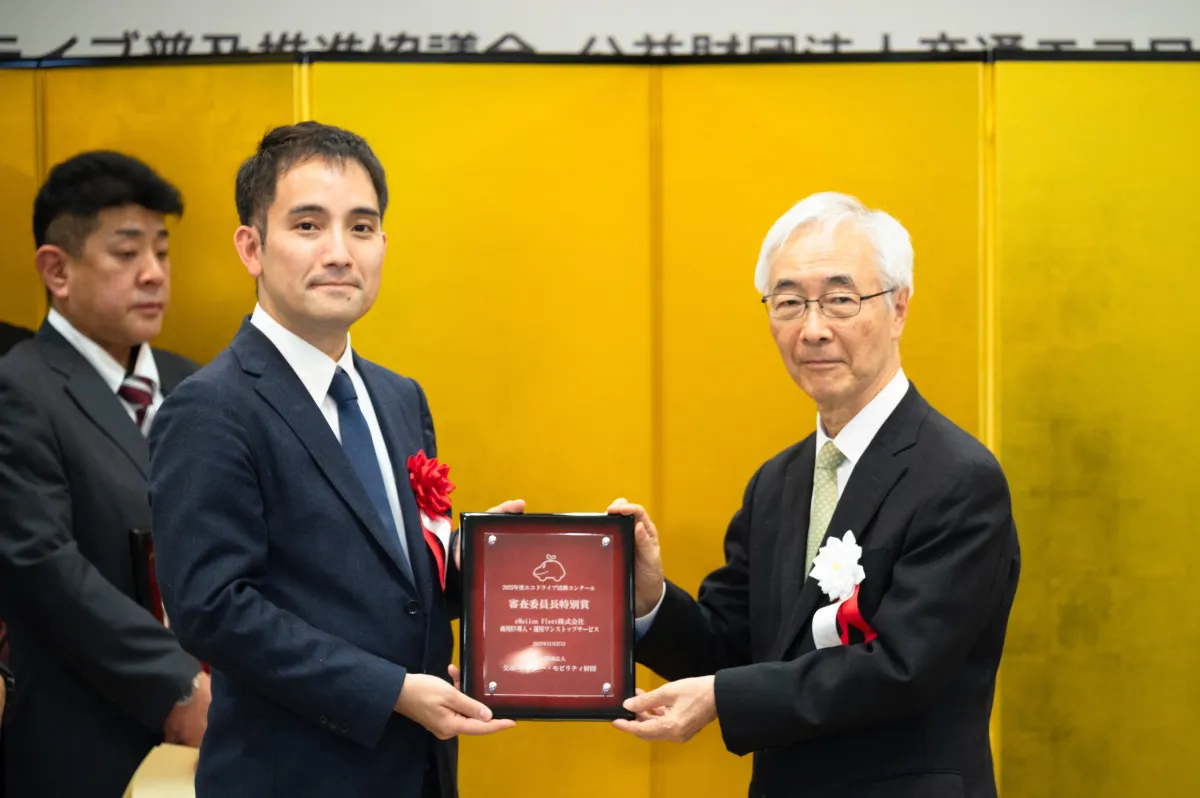 2025年11月27日、東京都内で開催された「エコドライブシンポジウム」において、商用EV導入を推進するeMotion Fleet株式会社が審査委員長特別賞を受賞し、講演を行いました。この賞は、企業や団体のエコドライブの優れた取り組みを表彰する「エコドライブ活動コンクール」において与えられました。