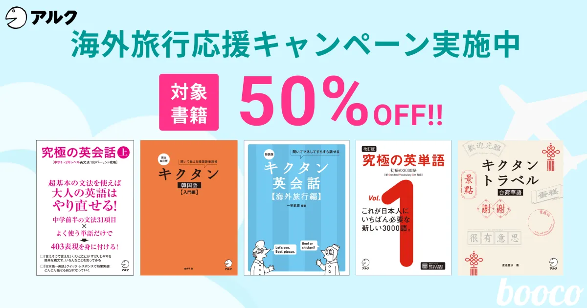 株式会社アルクが提供する語学学習アプリ「booco」は、2025年8月13日から9月18日まで、海外旅行を応援するための特別なキャンペーンをスタートします。このキャンペーンでは、英語、韓国語、台湾華語に関連する人気の書籍が通常価格から50%OFFで提供され、旅行前に必要なフレーズを学ぶチャンスです。特に、夏休みや秋の連休を利用して旅行に出かける人が増えていることを背景に、短期間で効率的に外国語を習得したいというニーズに応えています。