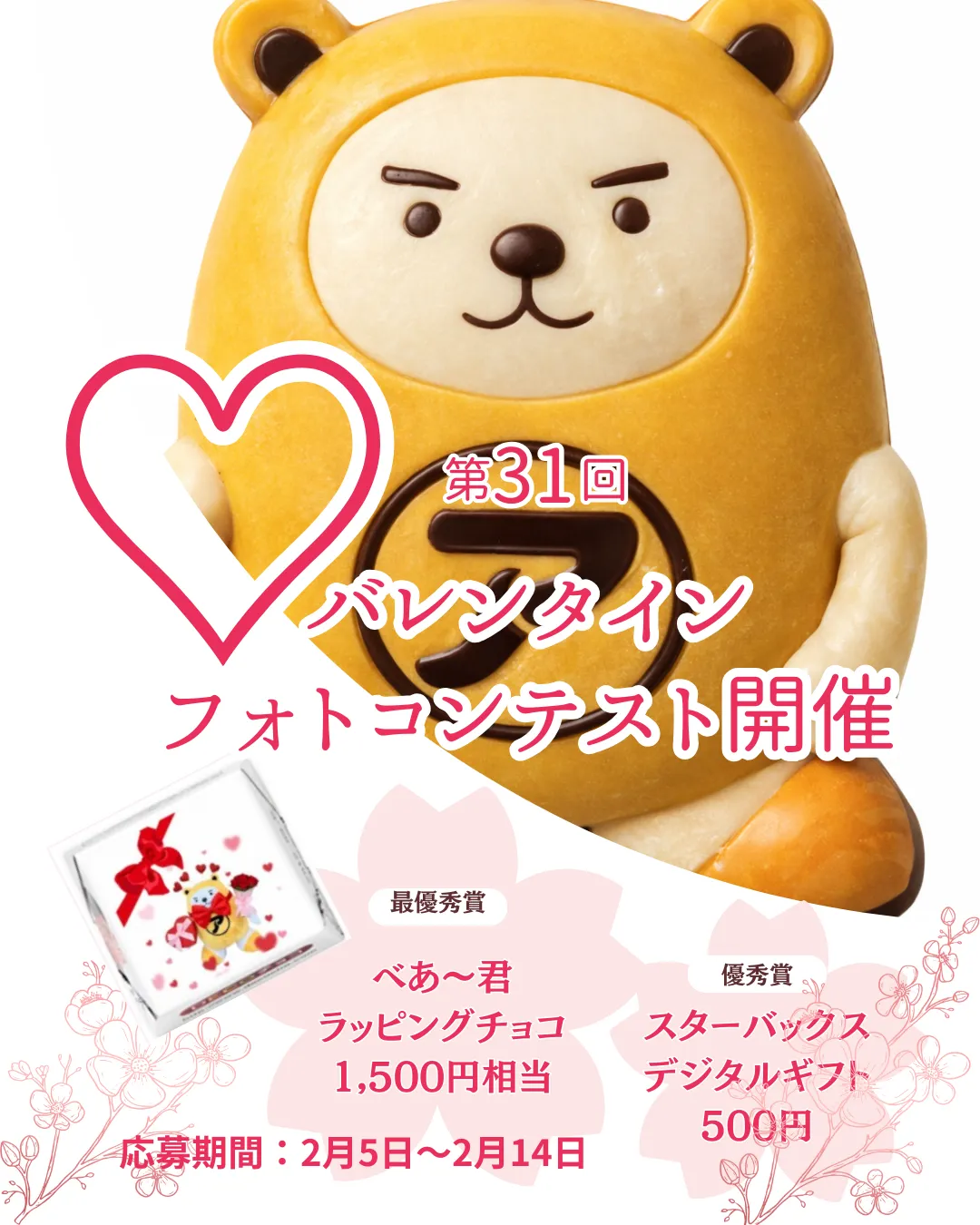 審査は「テーマとの親和性」や「独創性」、さらには「構図」や「ストーリー性」などがポイントになります。入選者には「べあ~君からのありがとう賞」として、最優秀作品にはべあ~君バレンタインチョコ(参考価格1,500円相当)、入賞にはStarbucksのeGift500円をプレゼントします。5630000