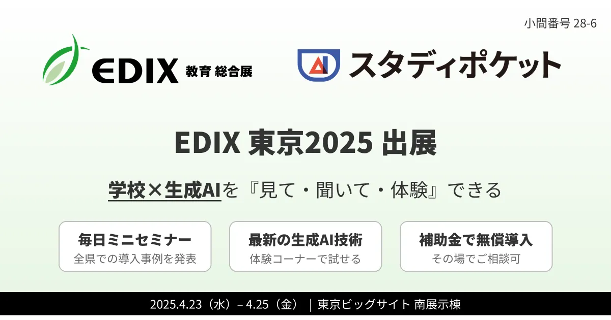 学校向けの生成AIサービスを手掛けるスタディポケット株式会社(東京都千代田区)は、2025年4月23日(水)から25日(金)まで、東京ビッグサイトにて開催される国内最大級の教育総合展「第16回EDIX東京」に出展します。ここでは、生成AIの教育現場における導入事例や、具体的な活用方法を展示。参加者が実際に生成AIを体験できる機会を提供します。