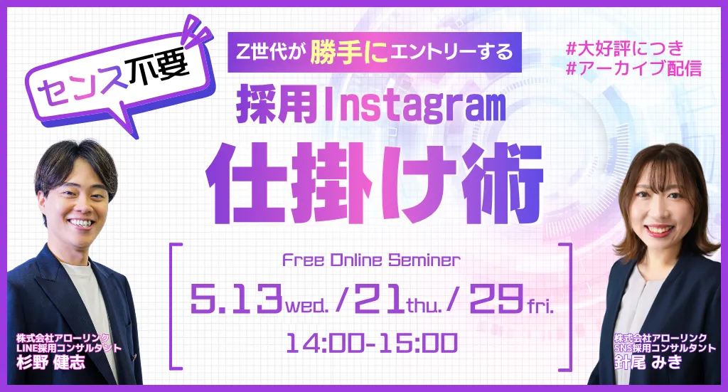 このセミナーは、デザインセンスに自信がない方や、Instagramを通じてのエントリーが芳しくないと感じている人に特にオススメです。具体的な投稿の型や仕組みについての理解を深めることで、多くの企業が抱えるZ世代採用の課題を克服できるでしょう。