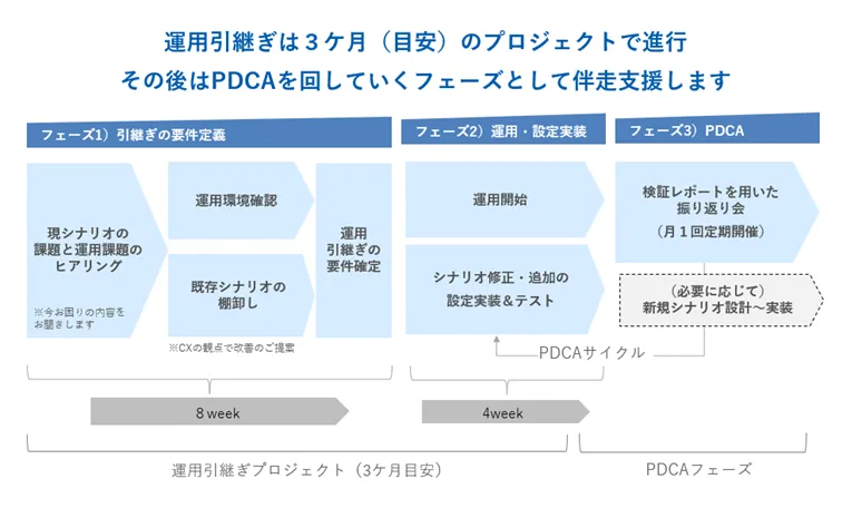 新サービスは、運用引継ぎプロジェクトとして進行します。運用環境の確認に始まり、引継ぎ要件の整理、シナリオの修正や追加設定を行います。その後は、PDCAサイクルに基づく振り返りと新規シナリオの設計から実行に至るまで、伴走型で支援します。