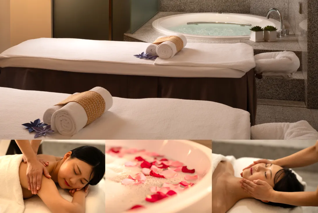 プランの第一歩は、フラワージェットバスでの贅沢なリラクセーション時間。花々が浮かぶ透き通った水に囲まれながら、日常の喧騒を忘れ、穏やかな香りに包まれることで心が解きほぐされていきます。この特別な空間で過ごすことで、まるで別世界にいるかのような気分を味わえます。