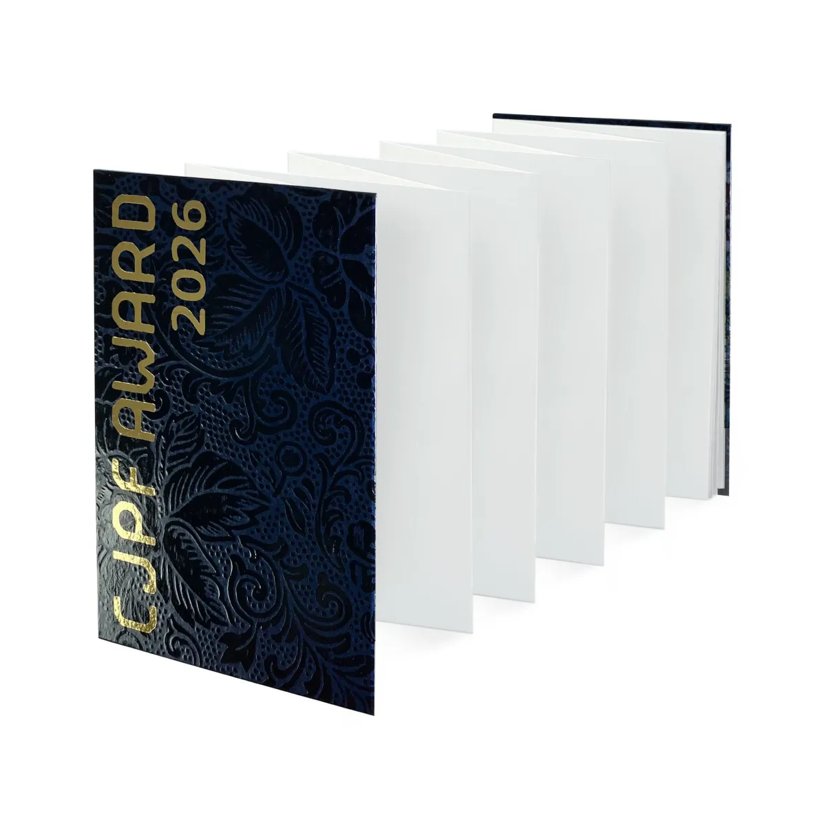 - - うるし紙の採用: 表紙には、職人が手間暇かけて仕上げたうるし紙を使用。その独特の深みと光沢は、味わいある仕上がりです。表紙にはアワードのロゴが金箔押しされています。