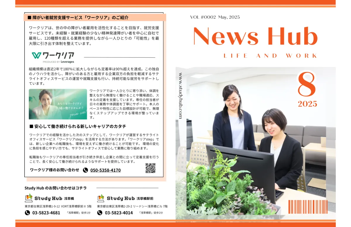 2025年8月号の月刊誌『News Hub』が発行されました。この号では、IT・PC業務に特化した就労支援の取り組みを幅広く紹介し、利用者や支援者のリアルな声を届けます。特集として、先月開催された「ワークリアとのコラボイベント」や、Study Hubの3拠点目となる「田町三田オフィス」の開設、さらに新たにオープンする「Study Hub 川崎」について詳しく取り上げています。