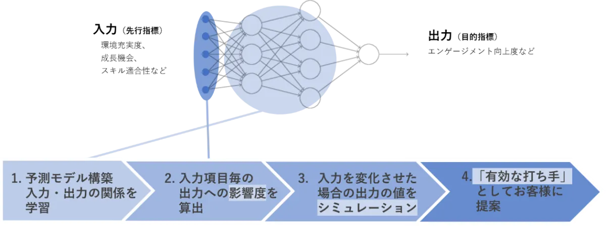 特に、機械学習を使った要因分析は、従業員が気づきにくい要因まで特定することを目指しており、入力値の変化がどのようにエンゲージメントに影響するのかをシミュレーションすることで、効果的な打ち手を提供します。