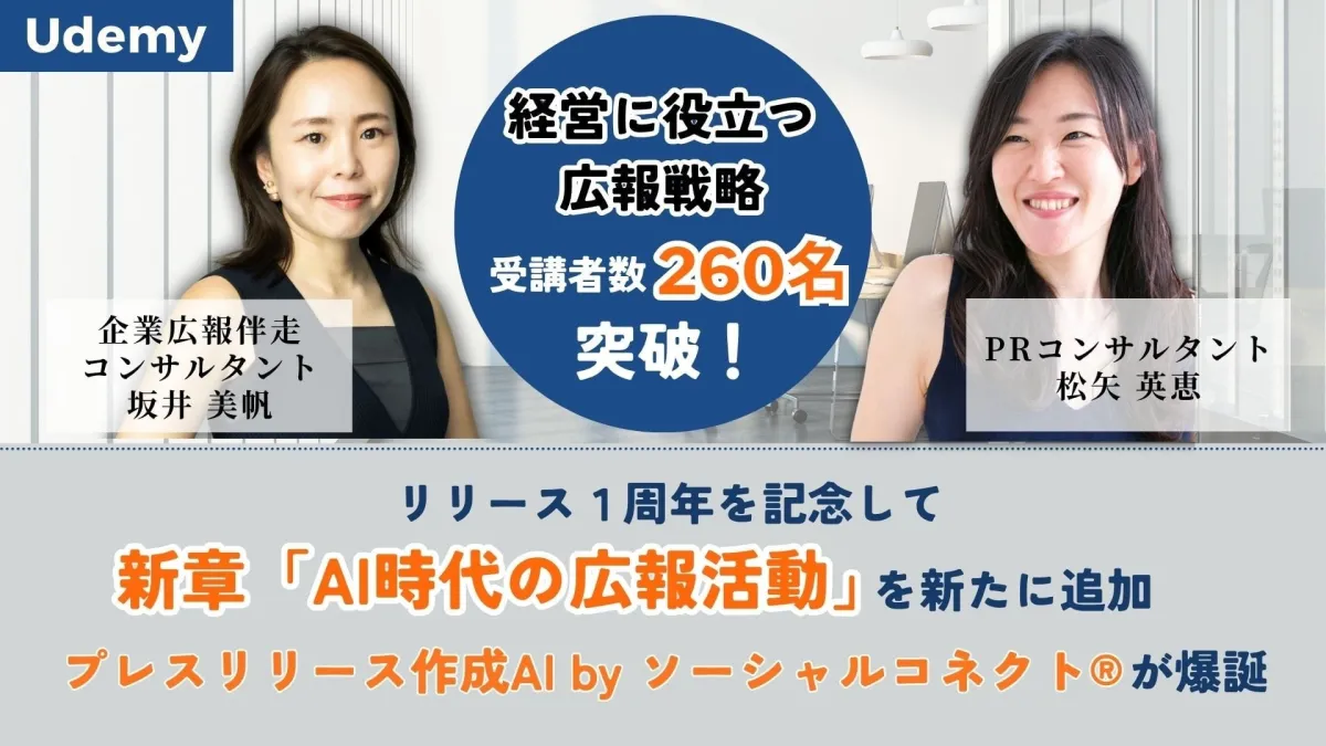 広報やPRの分野は最近、急速な技術革新によって変わりつつあります。特にAIの導入は、業務の効率化だけでなく、戦略の見直しにも影響を与えています。2026年4月、Udemyでは「経営に役立つ広報・PR戦略」講座が1周年を迎え、講座の内容がリニューアルされました。特に注目すべきは、新たに追加された「AI時代の広報活動」という章です。この章では、広報担当者がどのようにAIを活用して情報を設計し発信するべきかを体系的に解説しています。