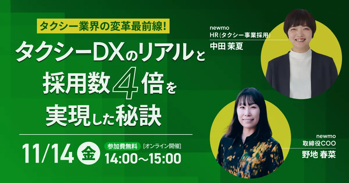 2025年11月14日、newmo株式会社が「タクシー業界の変革最前線 ― タクシーDXのリアルと採用数4倍を実現した秘訣」というオンラインセミナーを開催します。このイベントは、タクシー業界でのデジタルトランスフォーメーション(DX)がどのように実践され、特に人材採用の面で圧倒的な成果を上げているのかを具体的に学ぶ貴重な機会です。