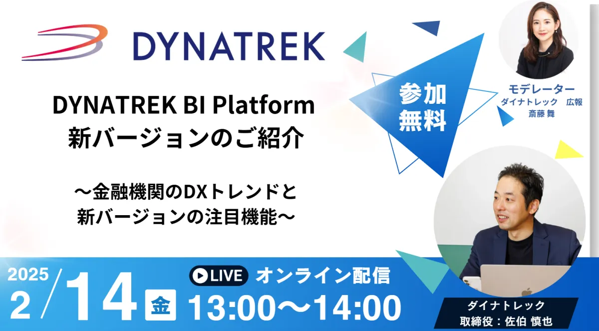 株式会社ダイナトレック(以下、ダイナトレック)は、全国の約30の金融機関と連携してデータ統合と活用のプロジェクトを進めています。この度、同社はオンラインセミナー「DYNATREK BI Platform 新バージョンのご紹介」を開催します。本セミナーでは、2025年4月リリース予定の新バージョンに焦点を当て、金融業界のデジタルトランスフォーメーション(DX)における最新のトレンドや、その背景を詳しく解説します。