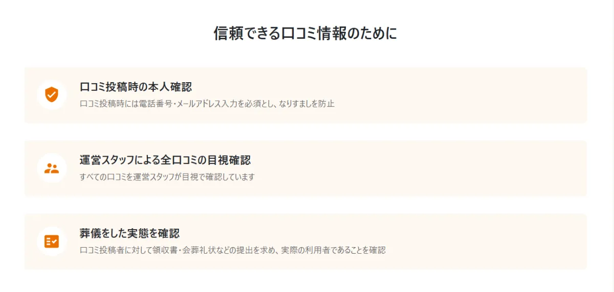 「葬儀の口コミ」には、以下のような特徴があることが利用者に信頼されています。