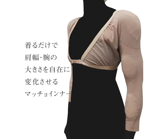 『マッチョインナー』は、男女兼用でフリーサイズのインナーです。特許技術を活かし、骨格に基づいたパターンと特製の素材を使用して作られており、着心地と体型の調整を両立させました。特に注目すべきは、その特殊パッドです。肩や二の腕にフィットするパッドが10枚付属しており、必要に応じて取り外しが可能です。このため、自身の好みにあった体型へと自由に調整ができます。