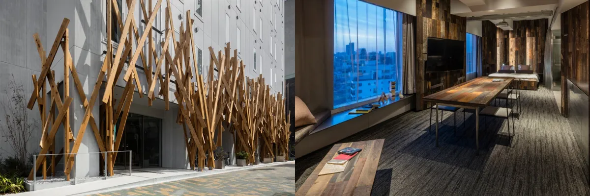 『ONE@Tokyo by insomnia』の外観およびインテリアデザインは、著名な建築家である隈研吾氏が手掛けており、押上エリアの歴史にインスパイアを受けたユニークな設計が特徴的です。伝統的な木材の組み方と無機質な工業素材を巧みに融合させたデザインは、古き良き下町の風情を残しつつも、新しさを感じさせる空間を提供します。これにより、訪れるゲストには鮮烈な印象を与えることでしょう。