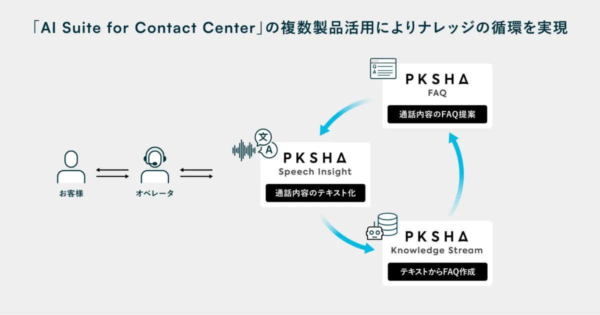 まず、「PKSHA Speech Insight」では、通話内容を自動で書き起こし、要約する機能を利用して問い合わせ後の処理時間を短縮します。この結果、オペレーターの業務負担が大幅に軽減され、生産性が向上します。次に、「PKSHA Knowledge Stream」により書き起こしデータからナレッジを抽出し、「PKSHA FAQ」へと情報を連携。これによって、既存のナレッジを効率よく更新しながら、日常の業務を行うことができます。