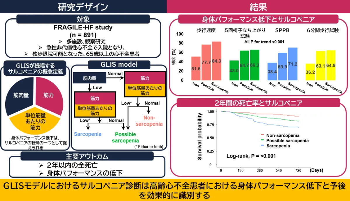 2016年から2018年にかけて15施設で行われた多施設共同研究「FRAGILE-HF」のデータを用いて、本研究は65歳以上の急性非代償性心不全患者891名を対象としました。この患者群において、GLISモデルを適用し、サルコペニアの有無が歩行速度や椅子立ち上がり、6分間歩行距離などの身体パフォーマンスに与える影響を検討しました。