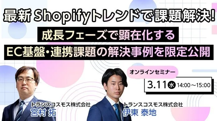トランスコスモスが主催するオンラインセミナー「最新 Shopifyトレンドで課題解決!」が、2026年3月11日(水)に開催されます。このセミナーでは、急速に変化するEC市場における最新のトレンドや、Shopifyの利点について詳しく解説し、特に成長期における企業のEC基盤の課題解決に向けた情報が提供されます。