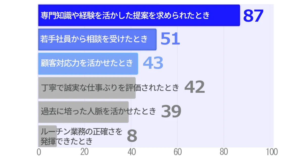調査の中で「頼られている」と感じる瞬間は多岐にわたりますが、特に「課題解決や判断が必要な場面」での役割が強調されています。経験に基づいた判断力が求められることで、シニア人材の価値が一層際立つ結果となっています。