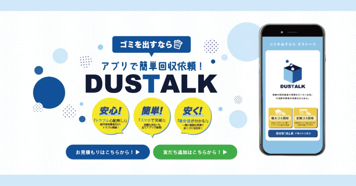 「DUSTALK」では、LINEを使って簡単に申し込みができ、営業時間外でも依頼できます。これによってスピーディーな対応が可能となり、急なゴミの処理にも対応できます。
