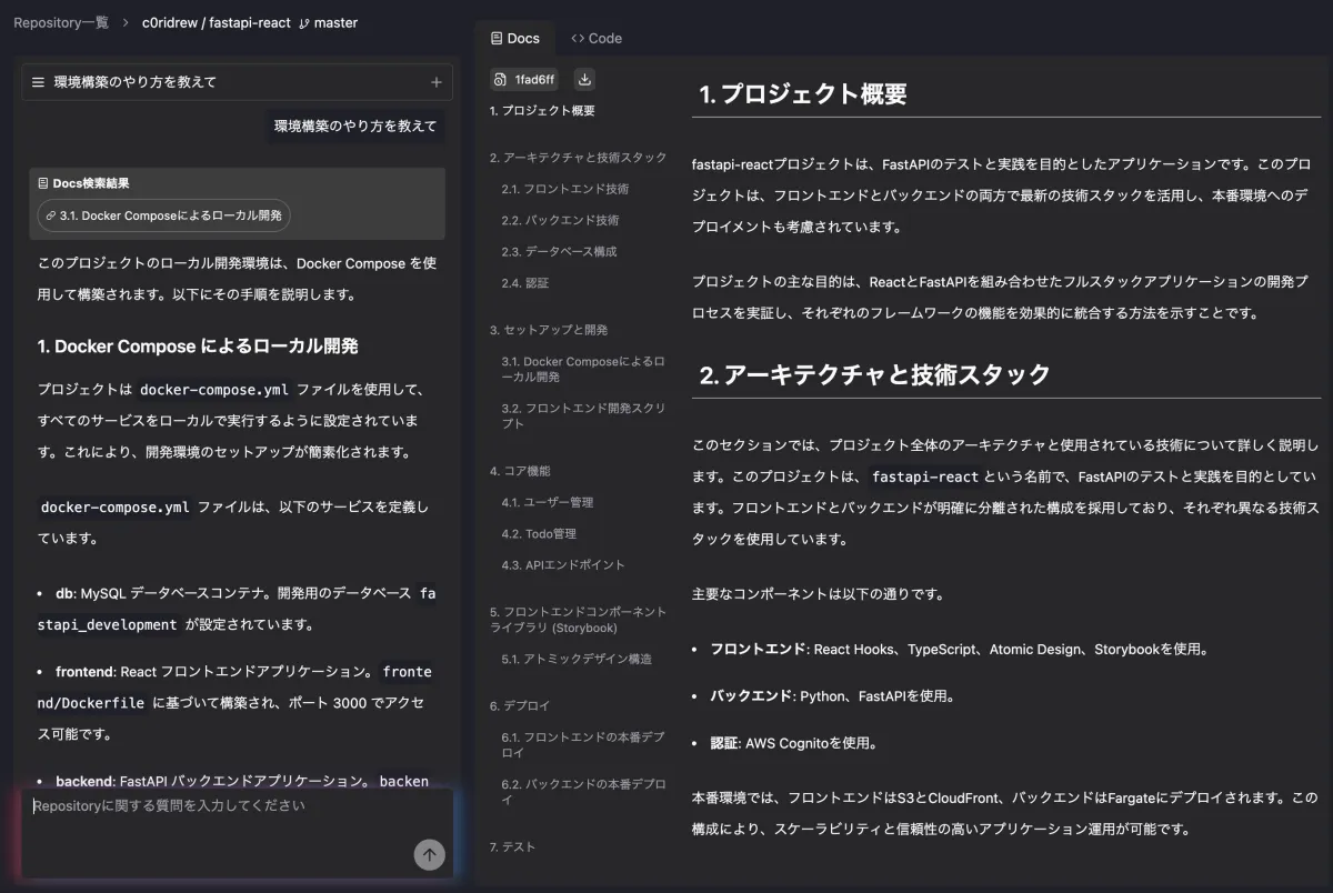 生成されたドキュメントや連携したソースコードについて、AIに直接質問が可能です。「この関数の動作は?」「このモジュールはどの設定ファイルを使うのか?」といった疑問に対して、的確な回答が得られます。この機能によって、ドキュメントを何度も読み直す必要がなくなり、効率的な理解が促進されます。