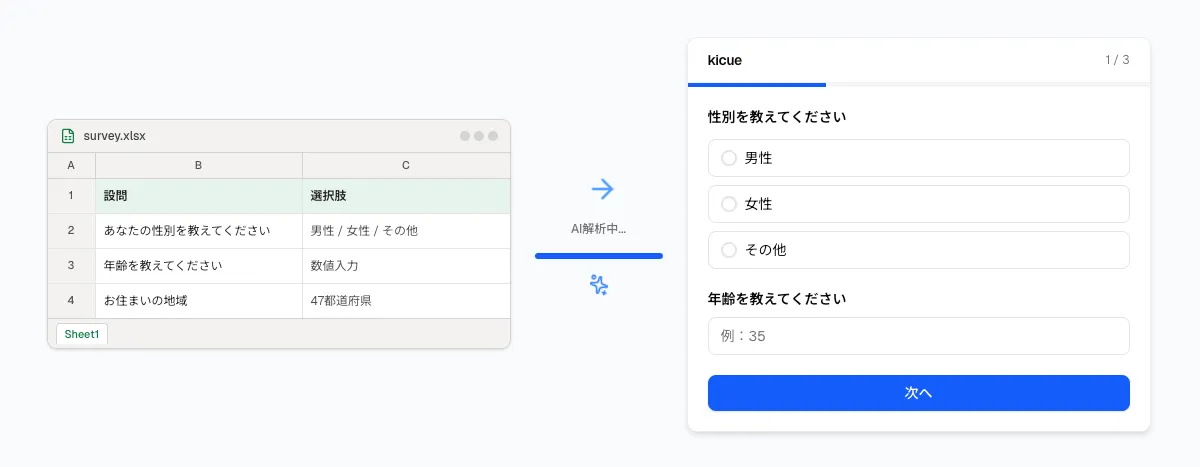Kicueの最大の特長は、調査票をアップロードするだけでAIが内容を解析し、Webアンケートを自動生成する点です。対応ファイル形式もExcel、Word、PDF、Markdownなど多岐にわたるため、普段使っている形式で簡単に利用できます。アップロードされたデータはAIの学習に使用されることはなく、解析後は完全に削除される安心設計です。