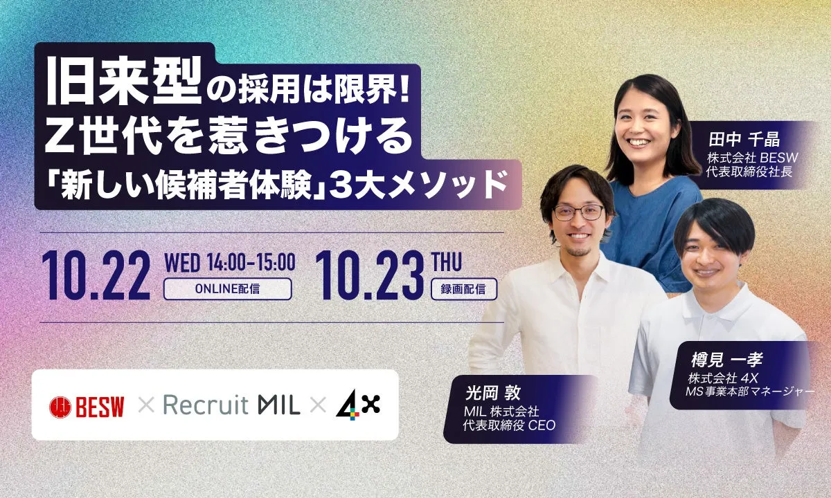 企業の採用活動が変化し続ける中、特にZ世代に向けた戦略が求められています。株式会社4Xでは、10月22日と23日の2日間、最新の採用メソッドをテーマにしたウェビナーを開催します。このウェビナーは、企業がどのようにZ世代の心を掴むことができるのかを探る重要な機会です。