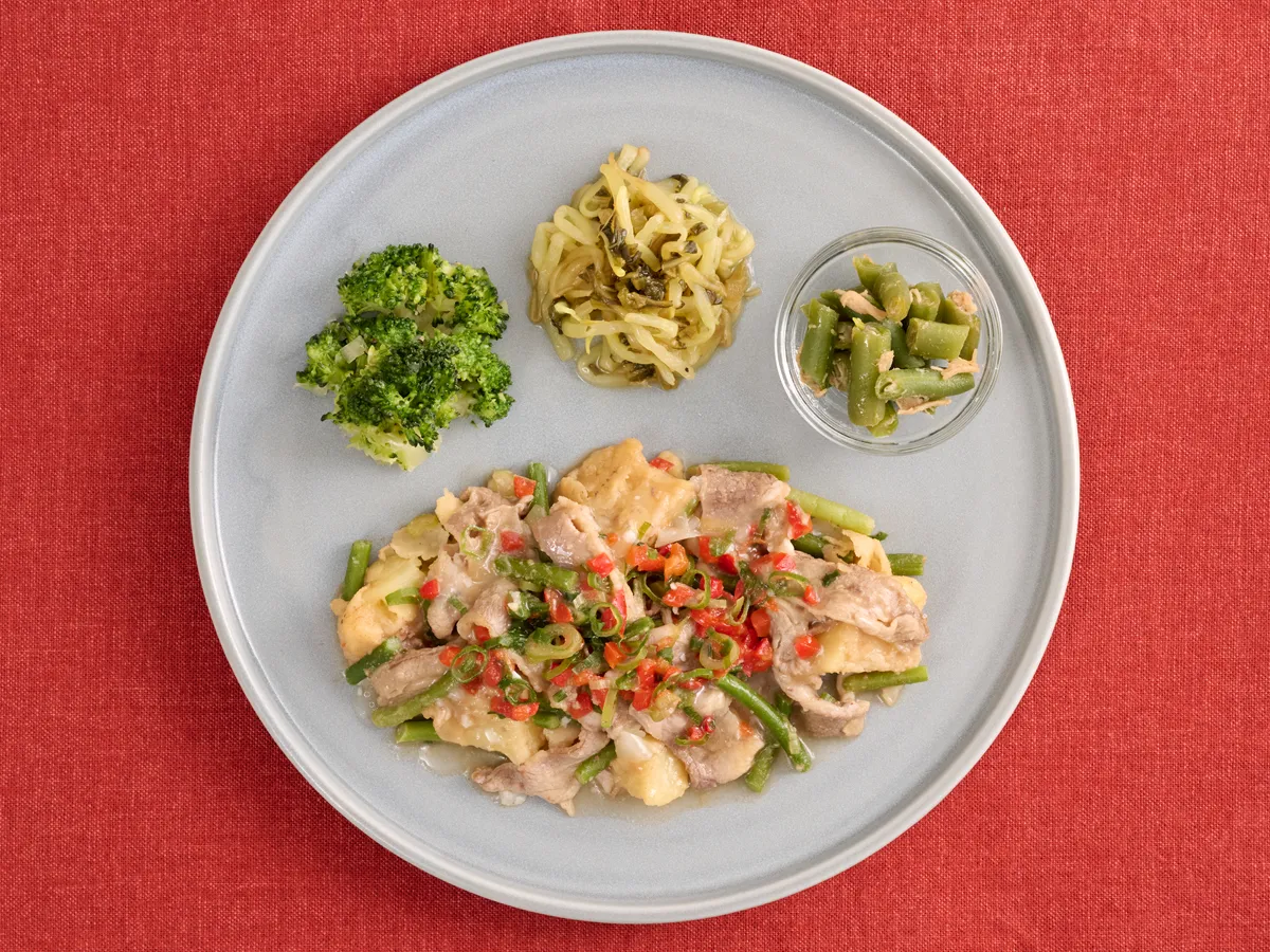 従来の肉じゃがとは一線を画す、濃厚でピリ辛な担々ソースが特徴です。柔らかい牛肉とじゃがいもがこのソースと絶妙に絡み合い、食べ応えのある一皿に仕上がっています。じゃがいもの自然な甘みは、担々ソースの辛さを引き立て、胡麻のコクを加え、肉の旨味が相乗効果を生み出します。肉じゃがと担々ソースの意外な組み合わせは、あなたの食卓に新しい風を吹き込むことでしょう。