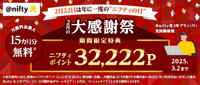 2月は「ニフティの日」(2月22日)を記念して、ニフティ株式会社が「@nifty光 3年プラン(N)」の新規申し込み者向けに「2月の大感謝祭」を実施しています。この期間中、新たに申し込むと通常よりも多くのニフティポイントがプレゼントされ、特に注目度の高いキャンペーンとなっています。