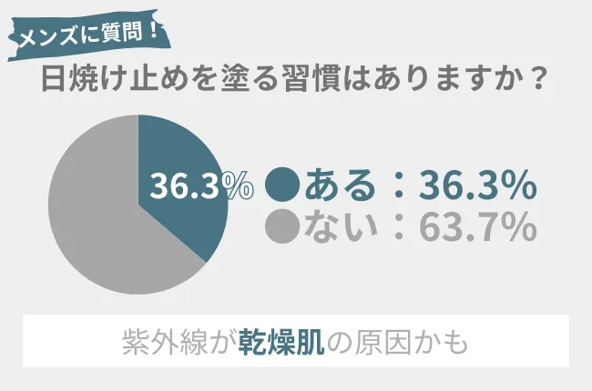 しかし、株式会社アースケアが行った調査によると、30代男性の63.7%が日焼け止めを塗る習慣がないという結果が出ています。